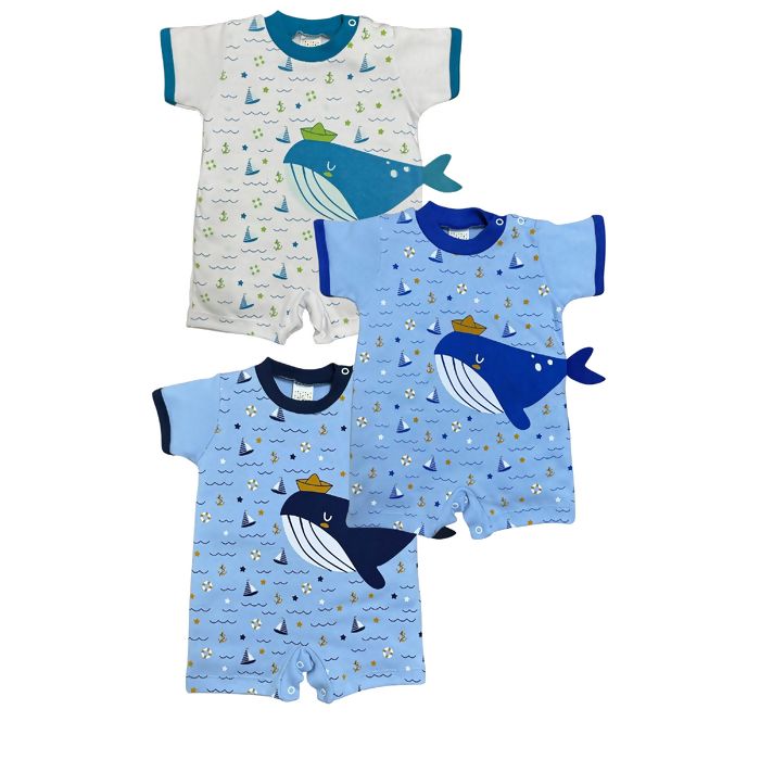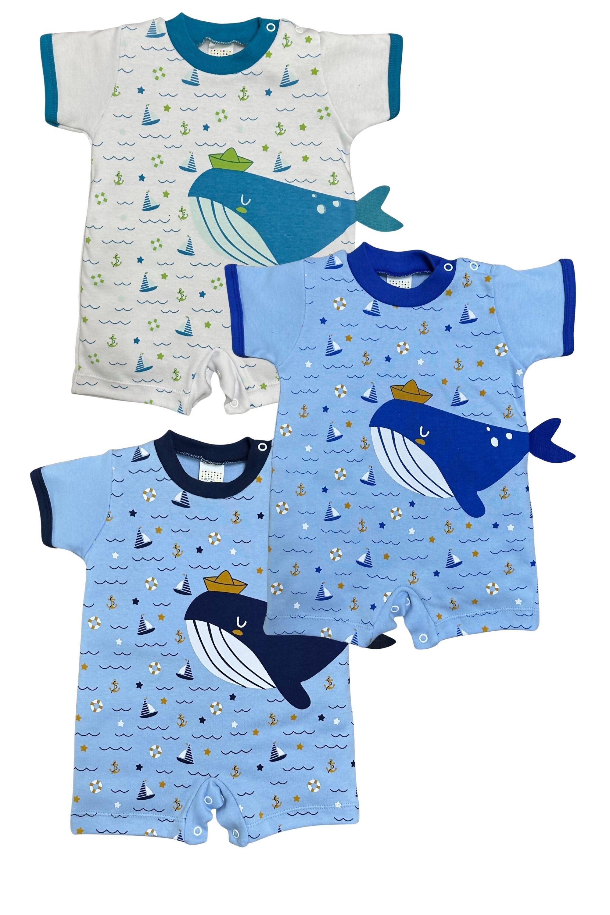 Macacão de bebê confeccionado em malha leve, com estampa divertida de baleia que transmite alegria e conforto.