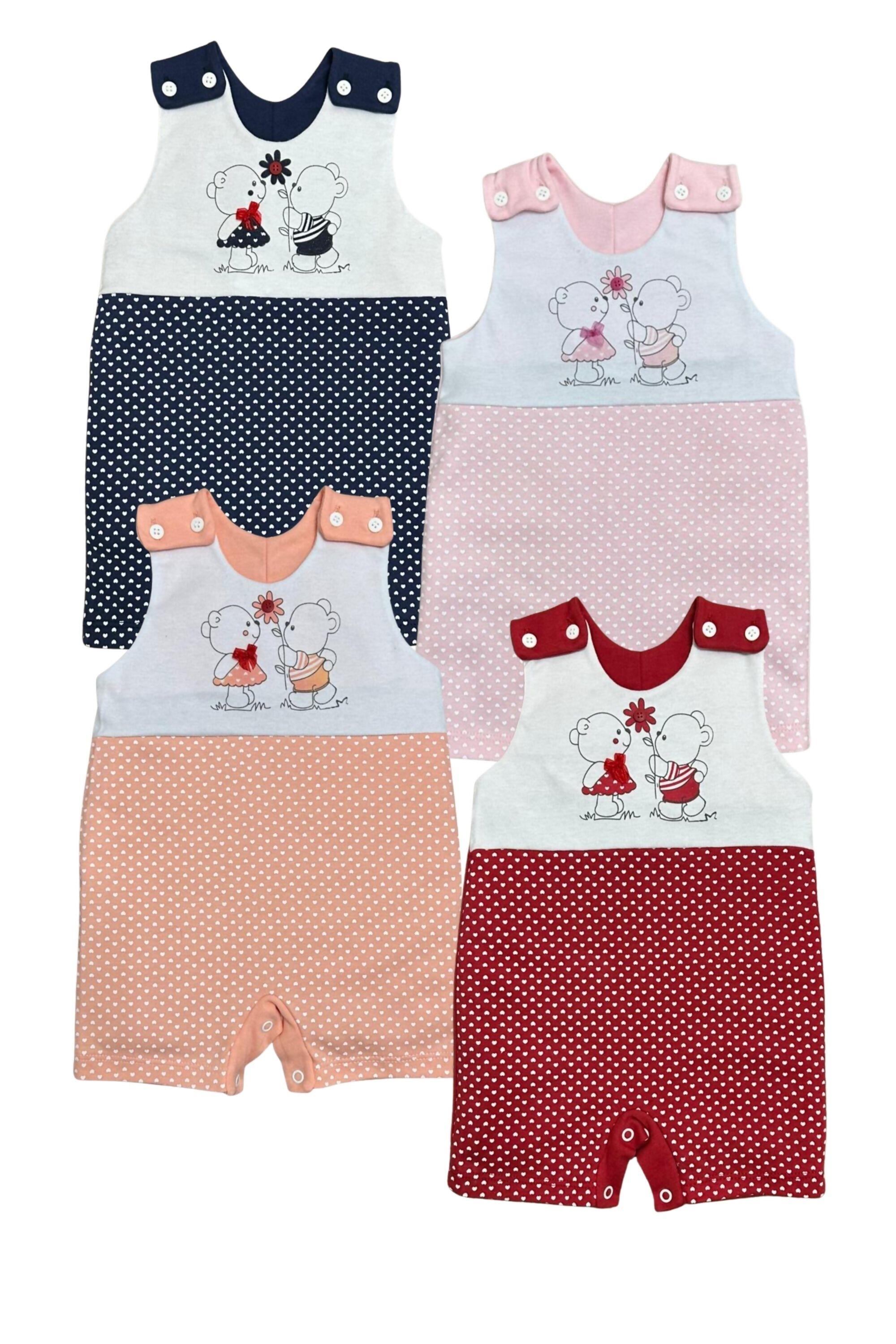 Macacão curto em malha macia, com estampa fofa de casal de ursos, perfeito para garantir conforto e estilo aos pequenos.
