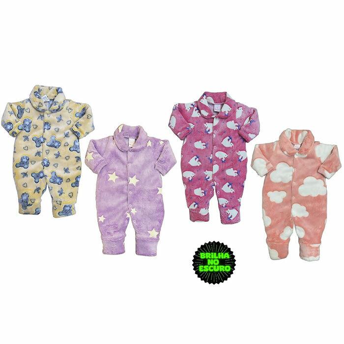 Estilo e conforto para encantar! Macacão feminino de plush com estampas variadas que brilham no escuro. Uma peça exclusiva da Petutinha, ideal para atrair lojistas e revendedores!