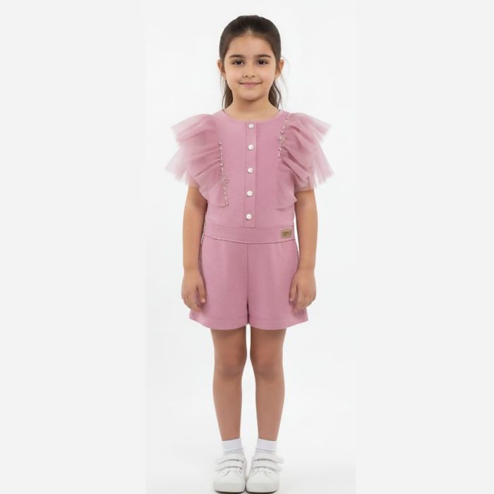 Macacão infantil pantacourt da Kiki Xodó, desenvolvido com acabamento refinado e detalhe em babado que valoriza o visual. Ideal para lojistas que buscam peças sofisticadas e com alta procura na coleção infantil. Consulte Nossa Equipe de Vendas.