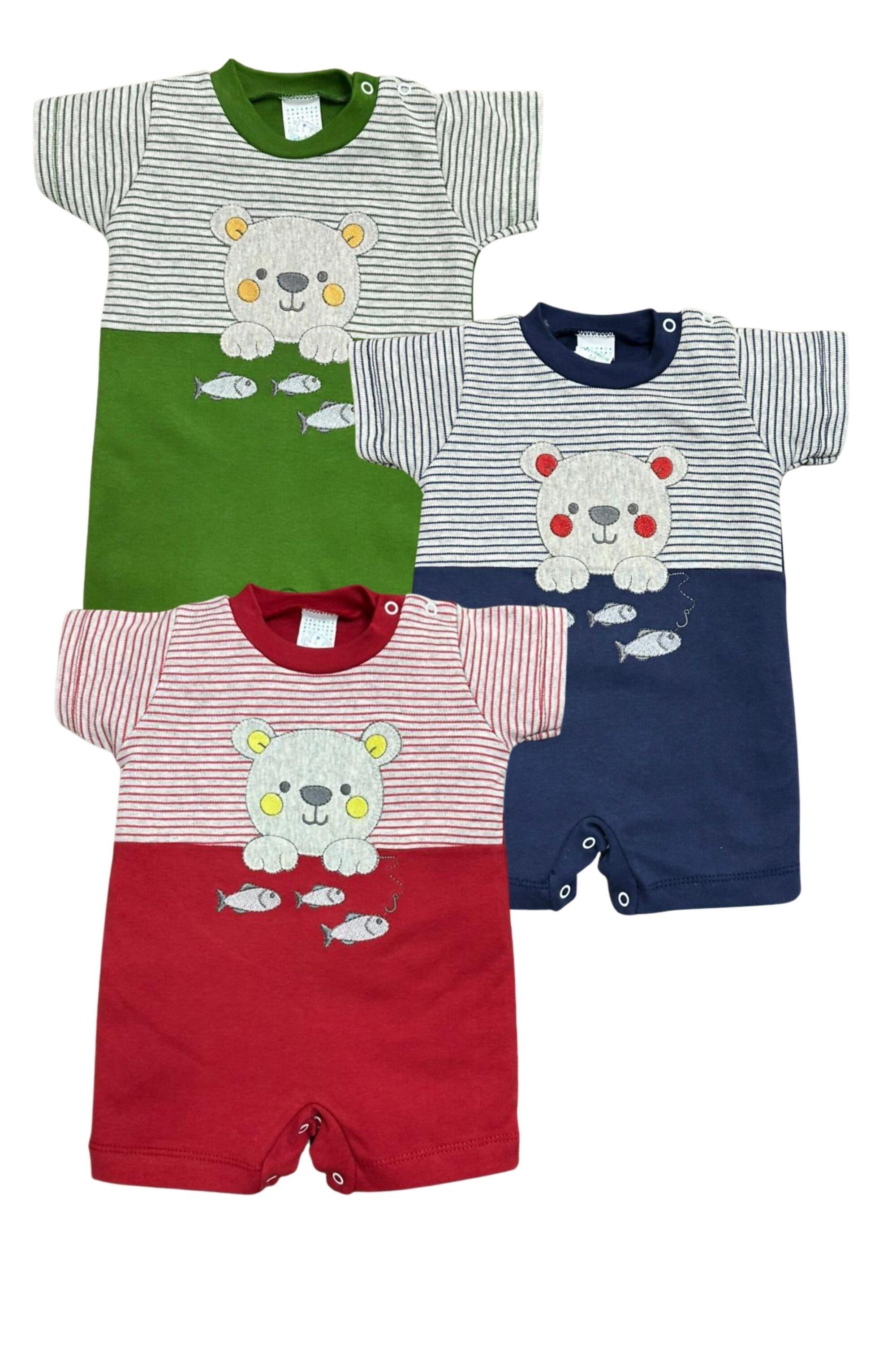 Macacão curto masculino com estampa divertida de urso e peixes, confeccionado em malha confortável. Um modelo encantador que une praticidade e conforto para o uso diário.