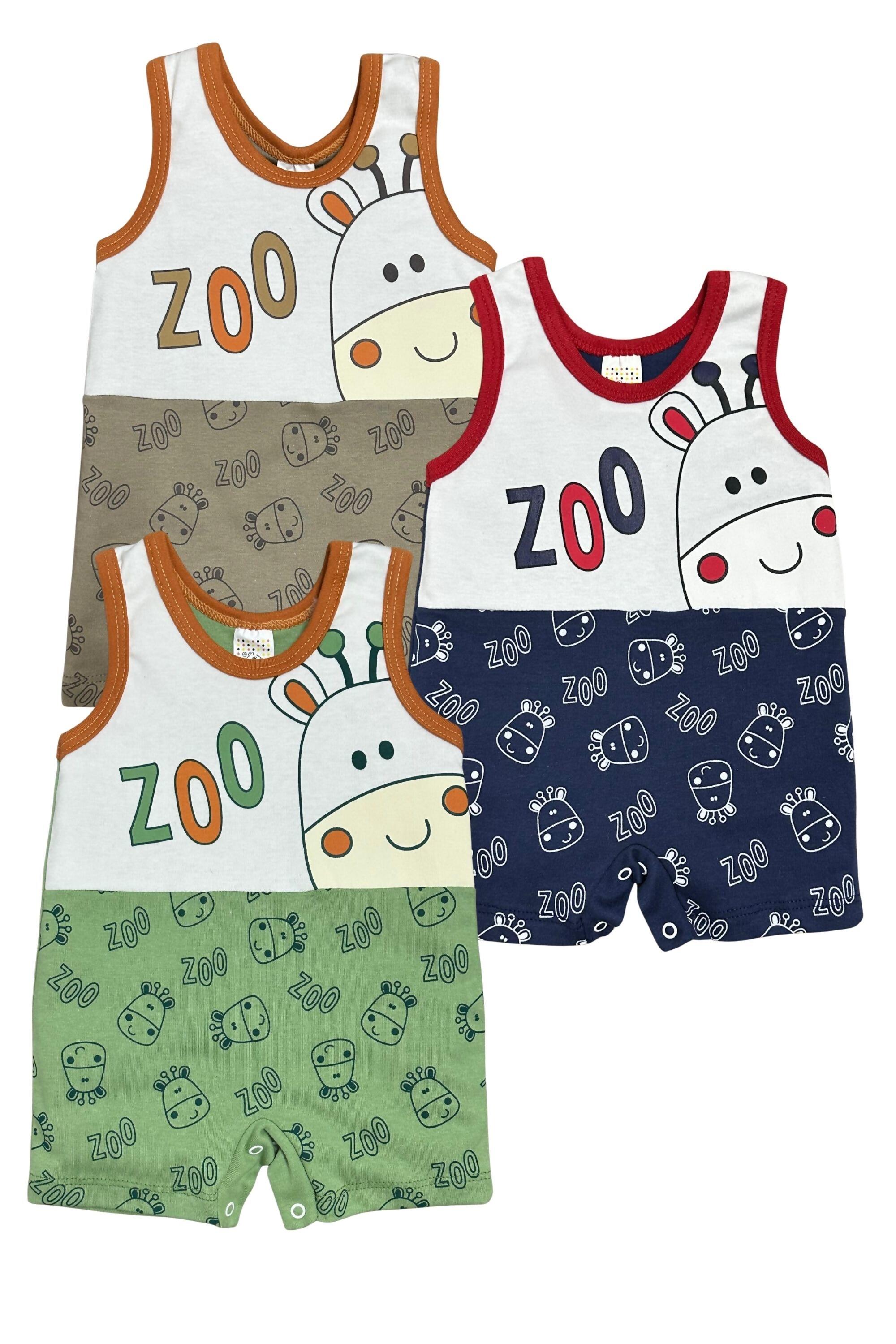 Macacão regata masculino com estampa inspirada no zoológico. Leve e fresco, é ideal para dias de calor, garantindo conforto e um visual divertido.