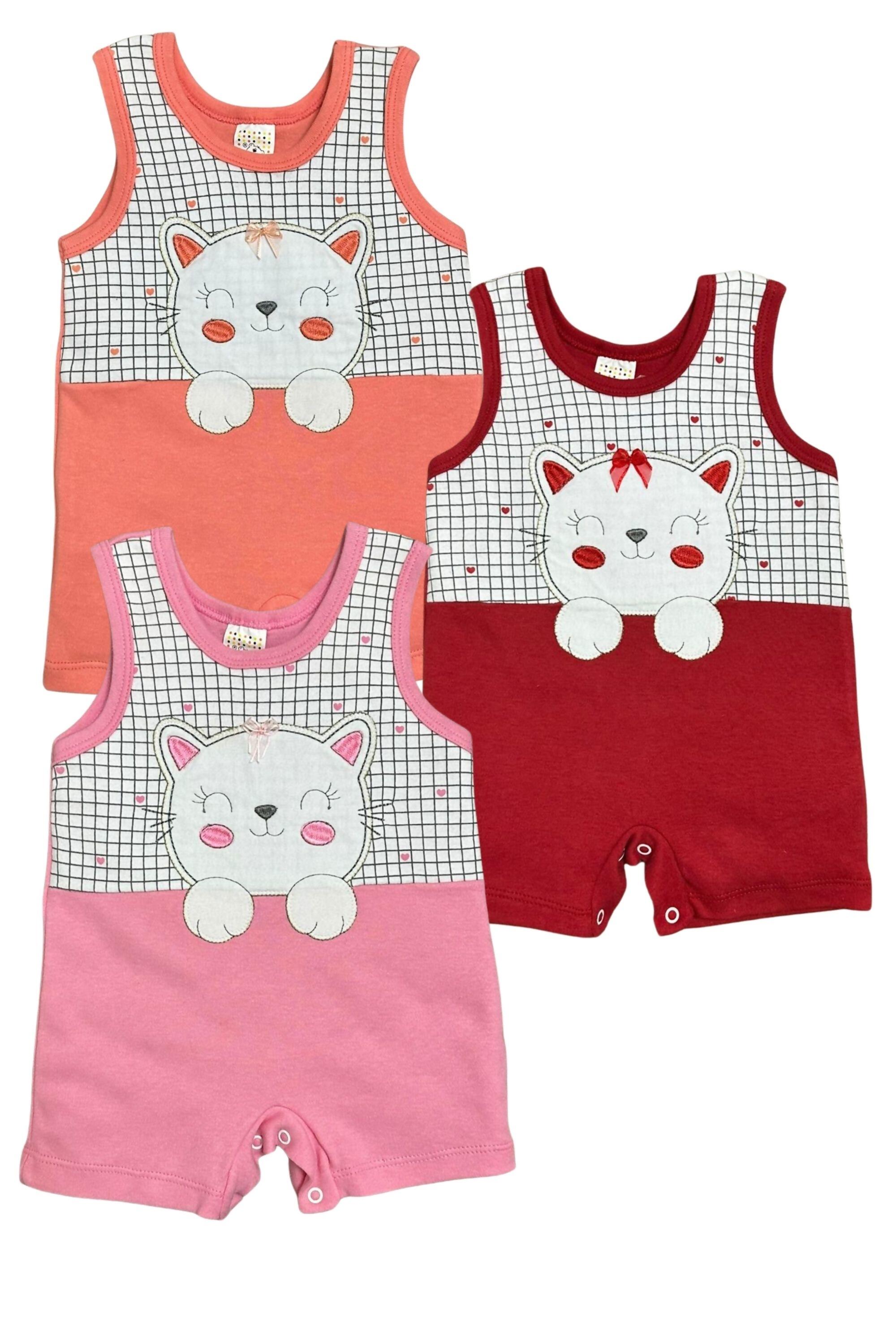 Macacão curto em malha de algodão, com estampa divertida de gatinha que garante leveza e estilo ao look das pequenas. Modelagem prática e confortável para o dia a dia.