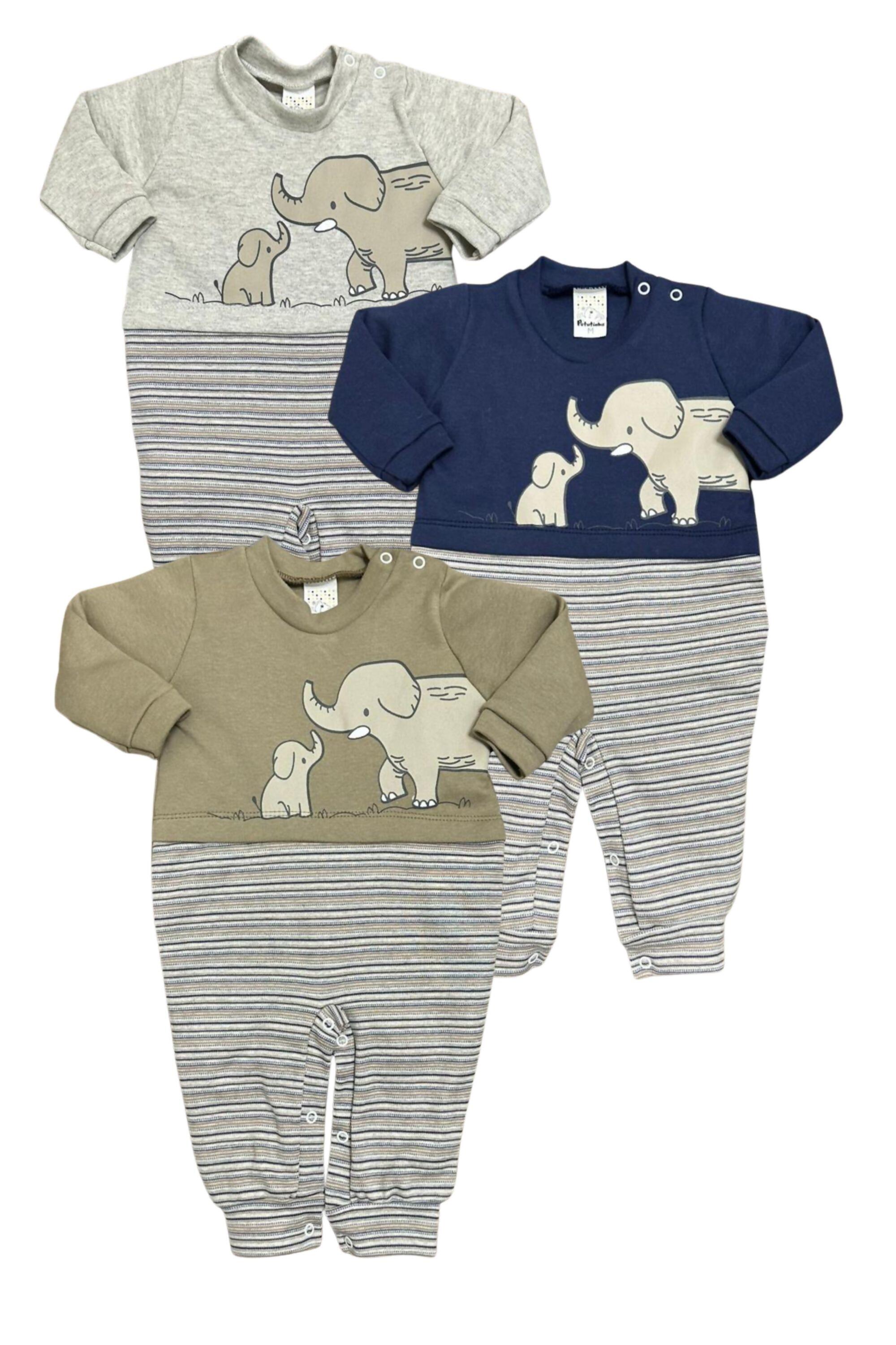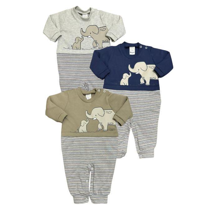 Macacão Petutinha masculino em suedine com estampa delicada de elefantes. Desenvolvido para oferecer conforto e liberdade de movimento aos recém-nascidos, com fechamento prático que facilita o vestir.