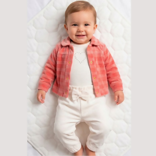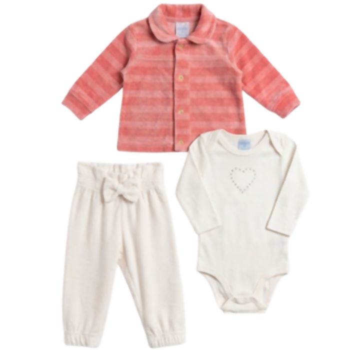 Conjunto de macacão com três peças, incluindo casaco, desenvolvido em plush macio para proporcionar conforto térmico e aconchego. A composição completa agrega praticidade e valor ao produto, sendo uma excelente opção para lojistas que buscam itens diferenciados para o enxoval. O acabamento de qualidade garante ótima apresentação no ponto de venda.