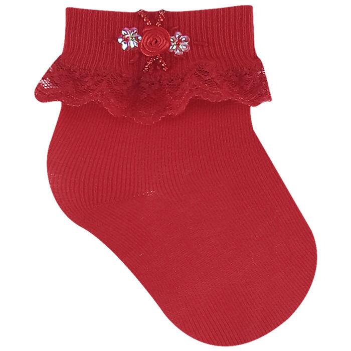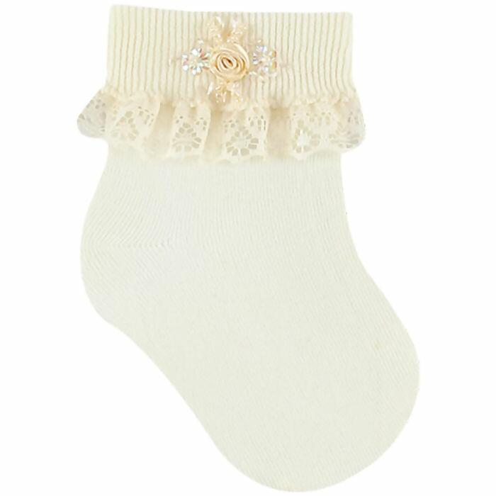 Confeccionado em poliamida, as meias soquete possui aplicação de babado e bordado a mão. É uma peça delicada com ricos detalhes em seu acabamento. Perfeito para as mamães que amam um acessório diferente e delicado sem deixar o conforto de lado.