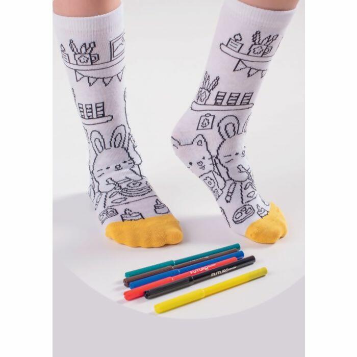 Par de meias infantis da marca Duck, acompanha canetinha especial para colorir, permitindo que a criança solte a criatividade e personalize sua própria peça. Após o uso, basta lavar para reutilizar e criar novas combinações sempre que desejar.