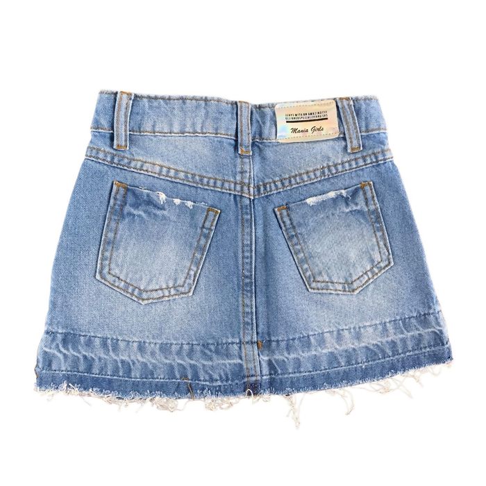 Saia infantil feminina jeans da Mania Kids, modelo com bolso faca, ideal para lojistas que buscam peças práticas, modernas e com excelente aceitação no varejo. O jeans proporciona durabilidade e versatilidade, garantindo boa performance de vendas e ótimo complemento para compor o mix infantil.