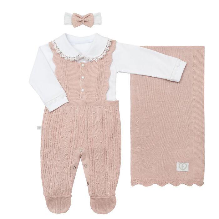 A Saída de Maternidade Feminina Fofinho é perfeita para lojistas que buscam produtos diferenciados, com acabamento de qualidade e visual encantador. O conjunto é composto por macacão em tricô estilo jardineira, body com gola boneca, laço para colocar na cabeça do bebê e manta coordenada, formando um kit completo, delicado e sofisticado.