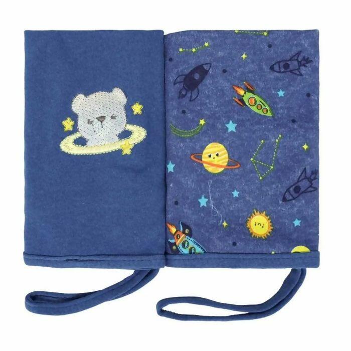 Estampa encantadora: A estampa de foguete azul marinho, combinada com detalhes bordados, adiciona um toque lúdico e sofisticado, tornando os momentos de alimentação mais especiais.