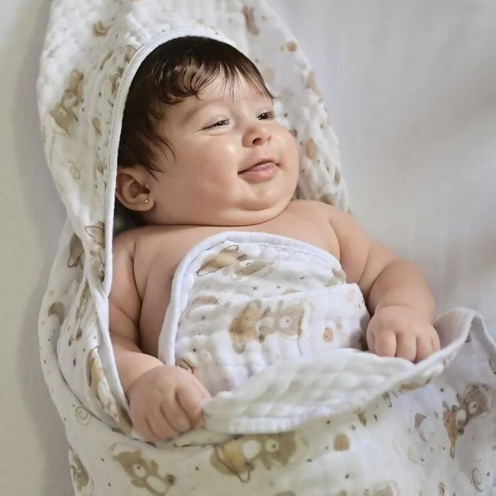 . Dupla Camada de Conforto: a toalha possui duas camadas de fralda 100% algodão, macia e confortável evitando qualquer irritação ou desconforto após o banho, proporcionando uma sensação de conforto sem igual.