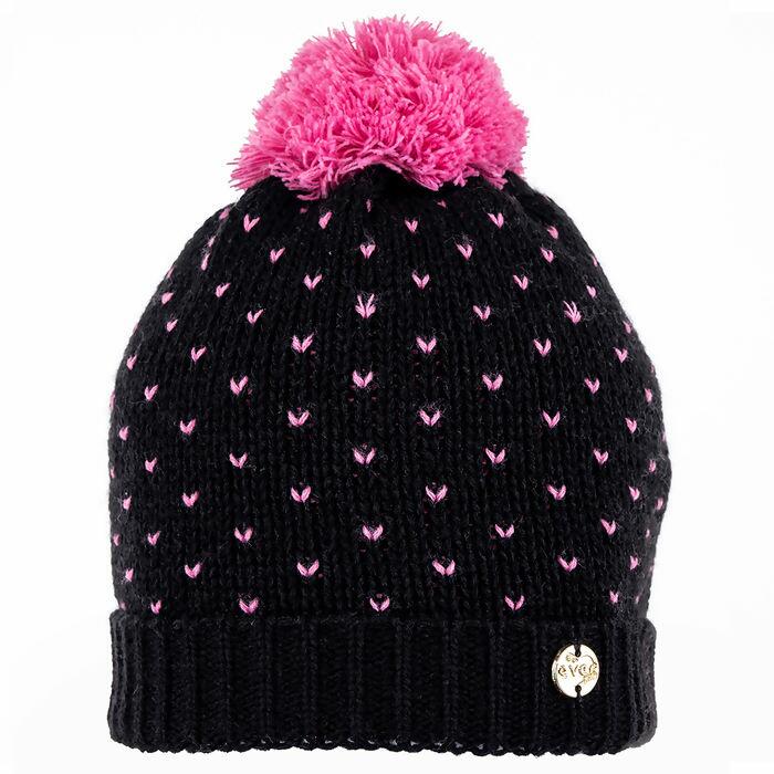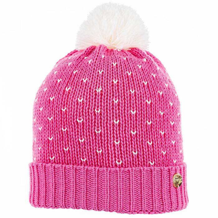 Touca infantil feminina em acrílico da marca Everly, com detalhe de corações em relevo, pompom no topo e pingente exclusivo. Perfeita para lojistas que buscam peças diferenciadas e com ótimo acabamento. Consulte nossa equipe de vendas. Dicas de estilo: combine com casacos e cachecóis coloridos para destacar ainda mais nas vitrines.