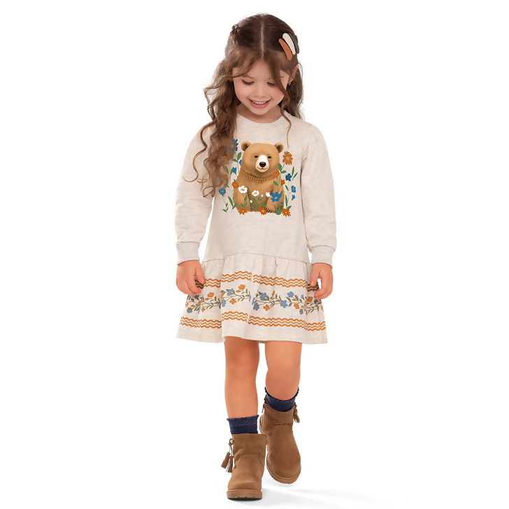 Vestido confeccionado em moletinho, garantindo conforto térmico e toque agradável. A estampa de ursa adiciona charme e personalidade à peça, tornando-a ideal para compor coleções de inverno com foco em estilo e funcionalidade.