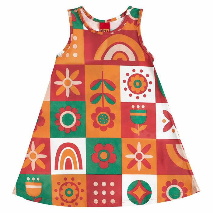 Estilo e diversão em um só look! O vestido regata traz uma estampa geométrica vibrante e caimento soltinho para os dias de brincadeira.