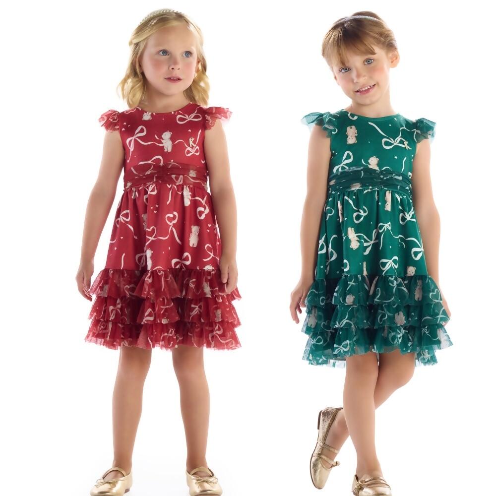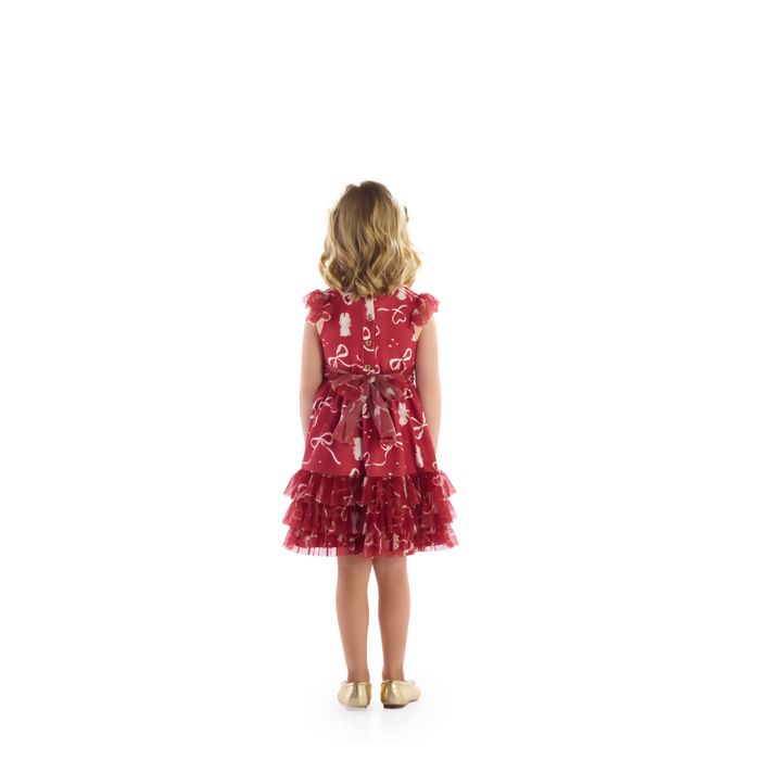 Vestido confeccionado em tecido leve e confortável, com detalhes de laços e babados que valorizam o visual com charme e delicadeza. A peça traduz o estilo sofisticado da marca, ideal para compor o mix de moda premium infantil.
