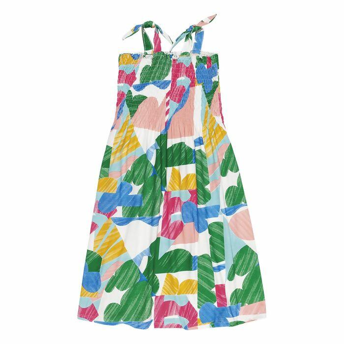 Vestido Infantil Nanai é confeccionado em Meia Malha, possui modelagem soltinha com franzido, acabamento frente e costas em lastex, divertida estampa rotativa e alças finas com debrum.