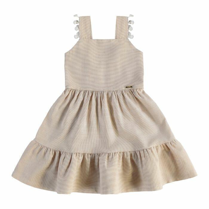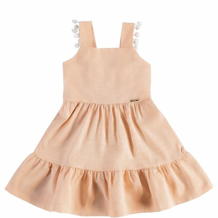 Vestido Primeiros Passos Dila com detalhe encantador de pompons aplicados nas alças frente e nas costas, garantindo um visual fofo e diferenciado. Tamanhos 1 ao 3. Consulte nossa equipe de vendas para mais informações.