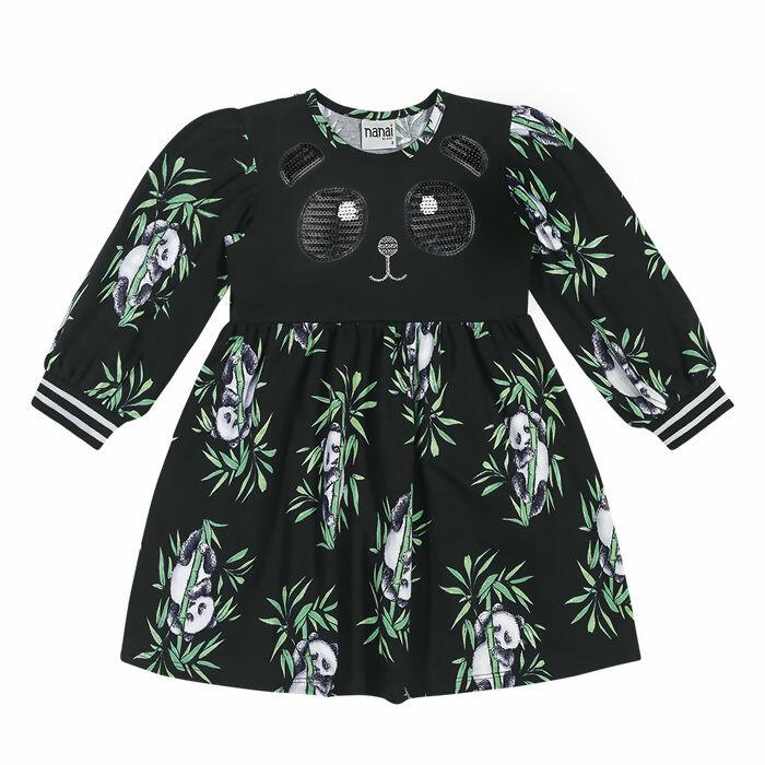Encante seus clientes com o vestido em malha manga longa da Nanai, com detalhe encantador de panda em lantejoulas. Uma peça exclusiva que combina charme e estilo para o público infantil!